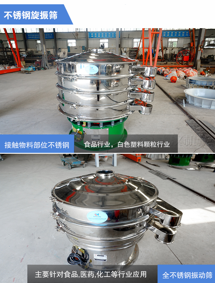 不銹鋼旋振篩的材質(zhì)樣式分為接觸物料部位為不銹鋼和全不銹鋼振動篩兩種。接觸物料為不銹鋼材質(zhì)的振動篩主要是物料對接觸的設備材質(zhì)有所要求,防止物料與碳鋼接觸對物料進行污染,特別是食品行業(yè),白色塑料顆粒行業(yè)等。全不銹鋼振動篩是主要針對食品,醫(yī)藥,化工等行業(yè)應用,其使用環(huán)境要求嚴格,容易對設備進行清理。