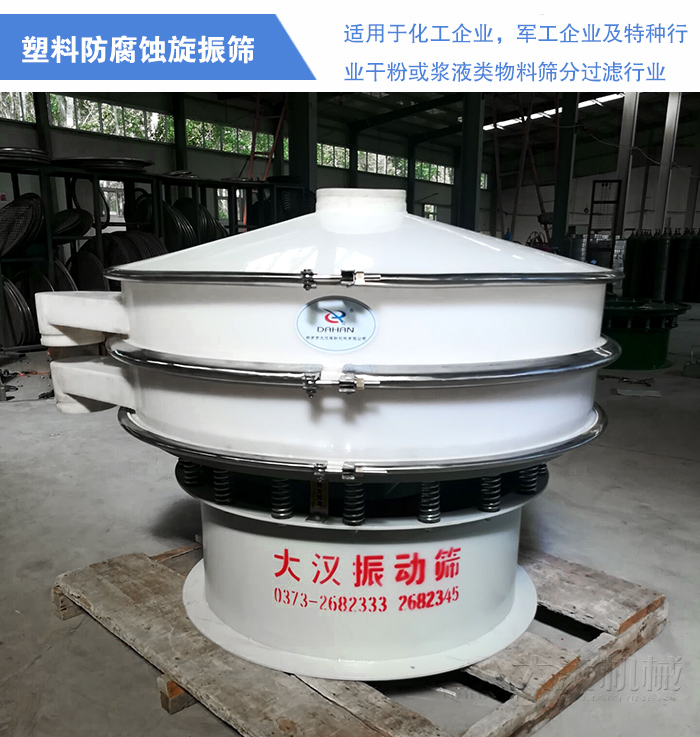 塑料防腐振動篩主要是為了解決篩分時特殊物料與金屬接觸而產(chǎn)生化學反應及腐蝕性較強等問題。振動篩接觸物料部位從篩框、篩網(wǎng)、中框、密封蓋和清網(wǎng)裝置等完全采用非金屬材料,完全排除了一些特殊物料與金屬接觸會產(chǎn)生化學反應等問題。本機適用于化工企業(yè),軍工企業(yè)及特種行業(yè)干粉或漿液類物料篩分過濾行業(yè)。