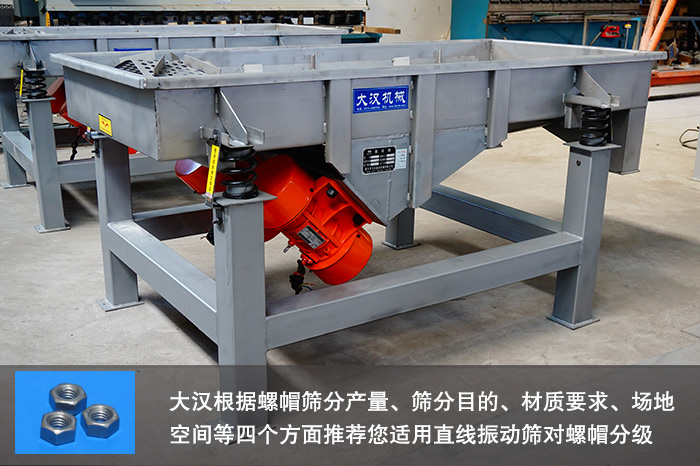 大漢根據(jù)螺帽篩分產(chǎn)量、篩分目的、材質(zhì)要求、場(chǎng)地空間等四個(gè)方面推薦您適用直線振動(dòng)篩對(duì)螺帽分級(jí)。