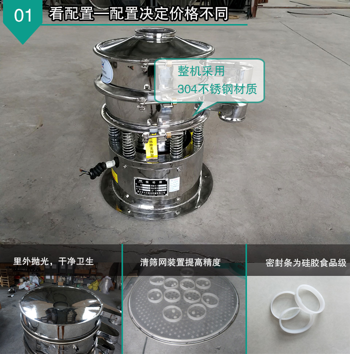 全不銹鋼振動篩整機采用304不銹鋼材質,里外拋光,干凈衛生,無毛刺,無死角,密封條為硅膠食品,彈簧外圍加304不銹鋼裙邊,同時還配備有專門的篩網清理裝置,可將堵網率降到低,過網率和處理精度得以有效提高。 看型號—型號決定價格不同