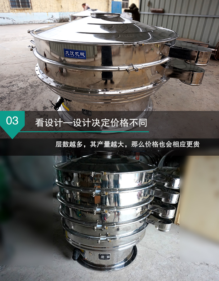 新鄉大漢全不銹篩振動篩生產的直線振動篩型號從DH600到DH2000,不同型號的全不銹鋼振動篩,其直徑、篩網面積是不同的,所以這就決定了不同型號的全不銹鋼振動篩產量是不同的,這也必然會造成全不銹鋼振動篩價格上存在明顯的差異。 看設計—設計決定價格不同
